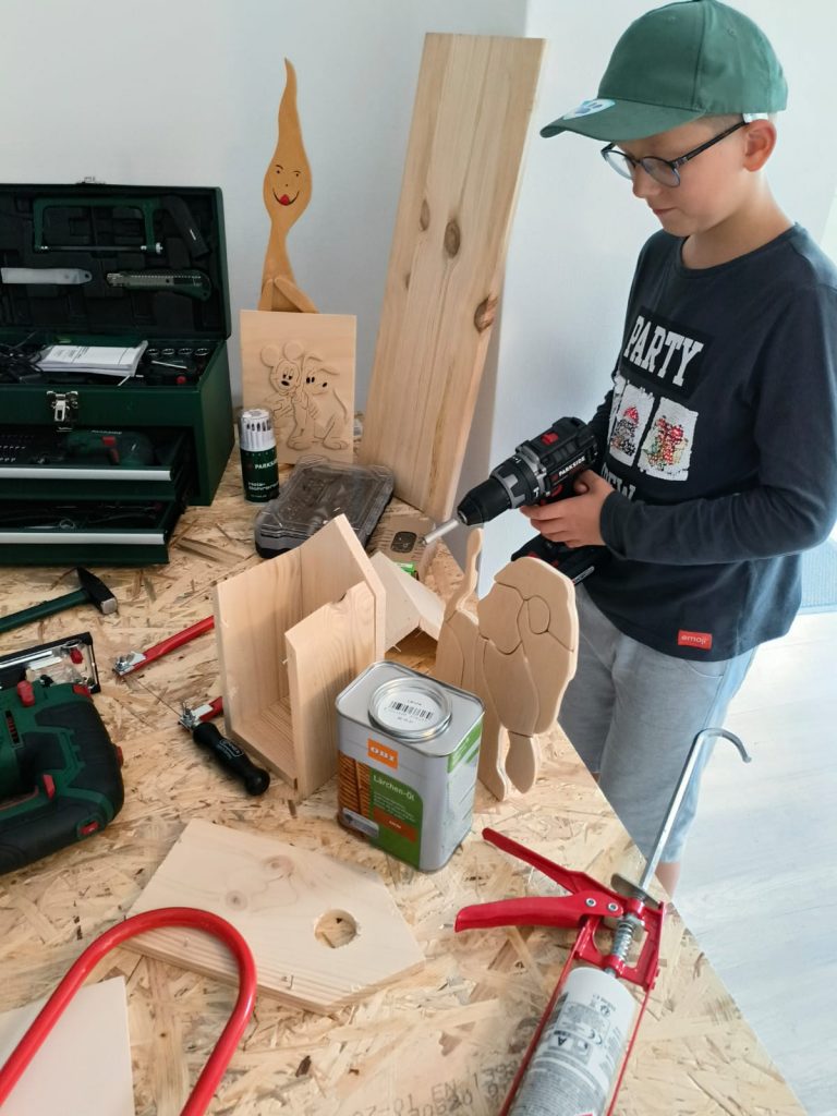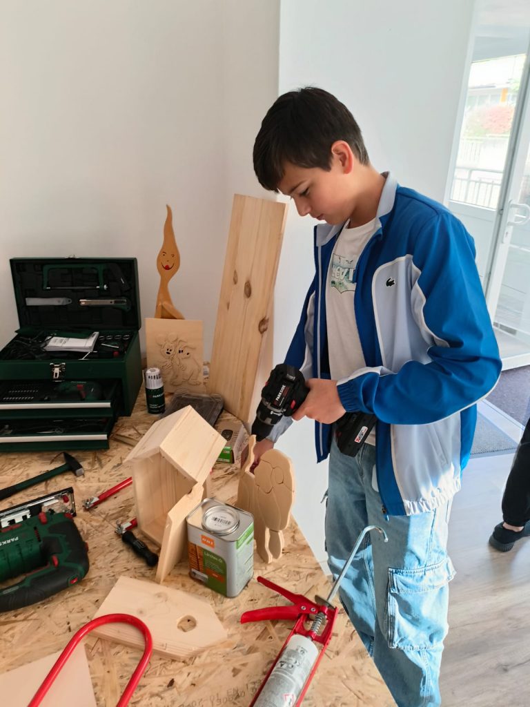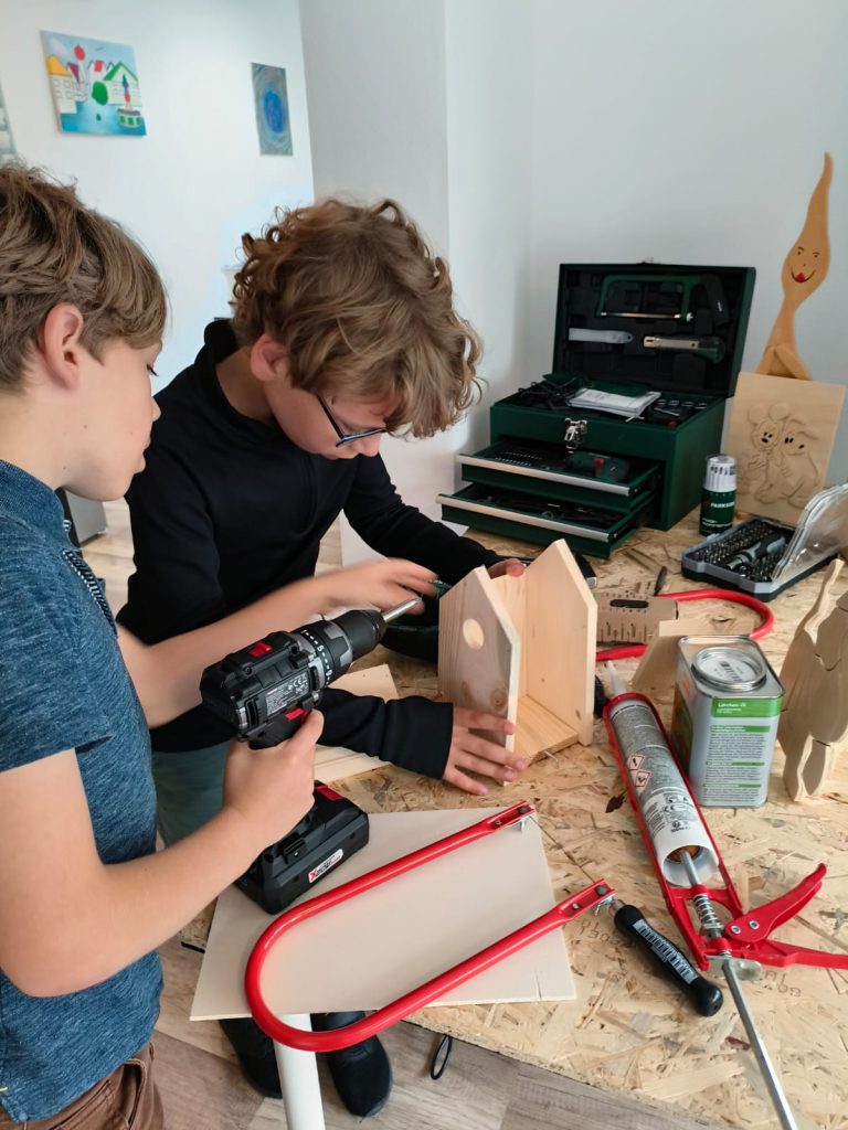 Diesmal durften die Kinder ihrer Kreativität mit Holz freien Lauf lassen: Gemeinsam mit unserem erfahrenen Projektleiter entstanden Vogelhäuschen und kleine Skulpturen. Die Atmosphäre war geprägt von konzentriertem Arbeiten, kleinen Erfolgserlebnissen und gegenseitiger Unterstützung – ein schönes Beispiel dafür, wie Kunst Menschen zusammenbringt und Gemeinschaft entstehen lässt.